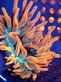 The Fire & Ice Anemone lives up to its name β flaunting blazing orange-red tentacles rimmed with cool bluish-white tips, sometimes accented by radiant green mouths or frosted bases. This stunning coloration adds movement and visual heat to any reef tank.
